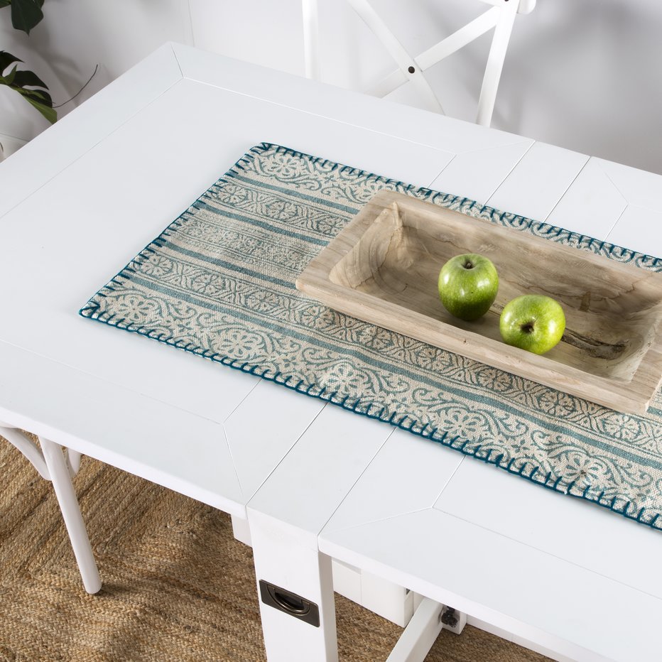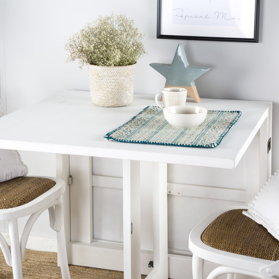 - La mesa de comedor plegable Tan de madera en color blanco es ideal para recibir invitados en casa. Plegada ocupa el mismo espacio que un cubrerradiador, 16x90x78h cm. Además, puede comportarse como un mueble auxiliar para completar estancias, vestir zonas de paso, una entrada o usarla incluso como mesa de cocina. En cambio, si la abres totalmente es apta para alojar hasta 8 personas. Tú eliges; puedes abrirla por uno de sus lados o por los dos, adaptándose así a las necesidades de espacio en cada momento. Además, su diseño rectilíneo y puramente funcional de estilo bohemio con pinceladas nórdicas ofrece muchas posibilidades decorativas distintas.